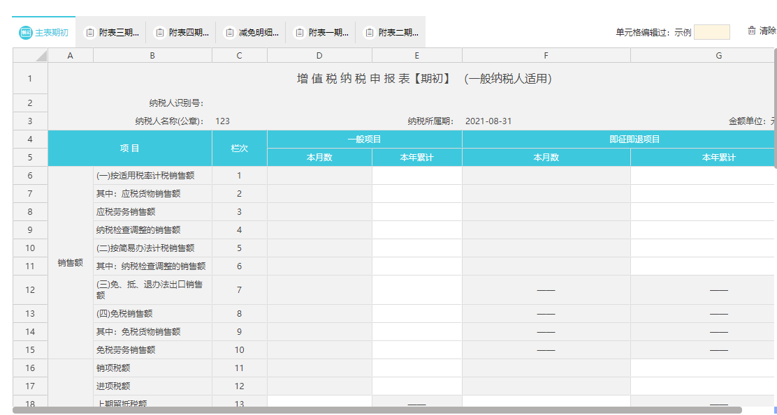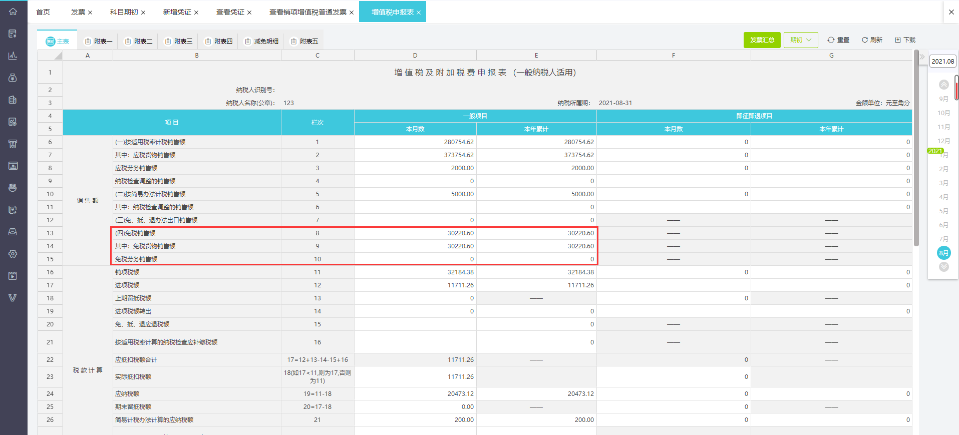如发票明细里的计税方法为免税,现系统也会将数据自动取数到附表一以及主表的免税项目里列示