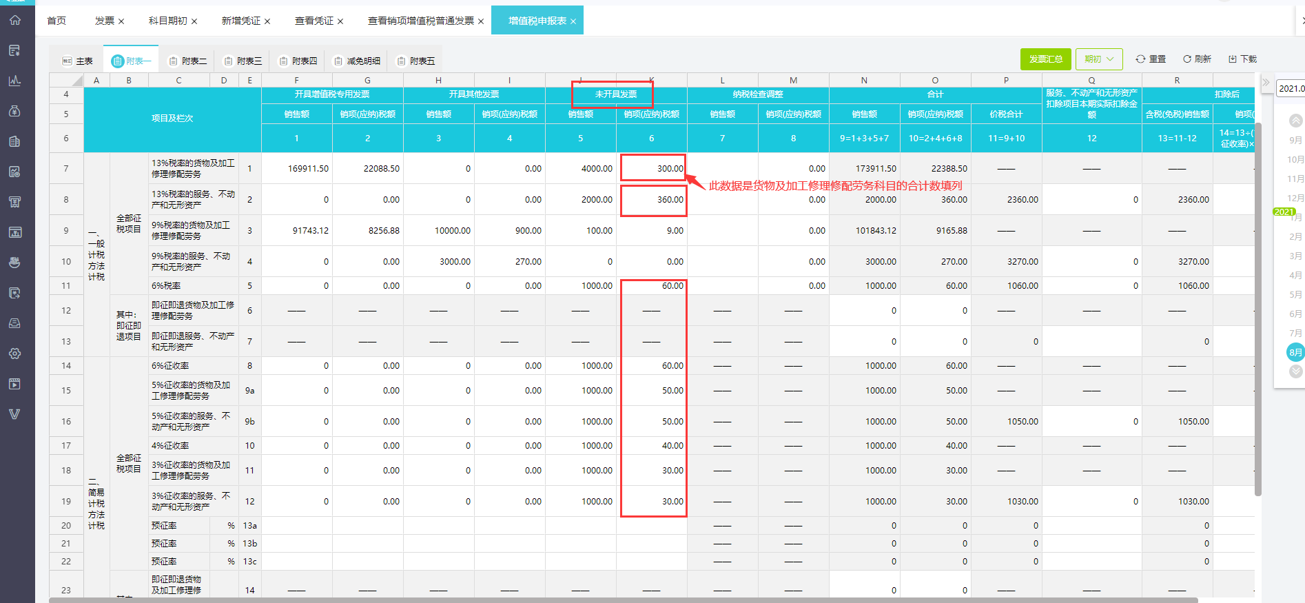开具增值税专用发票这一列的取数票种新增机动车销售统一发票,税表根据发票明细里的税率、征税项目、计税方法将发票数据自动归集到对应的项目