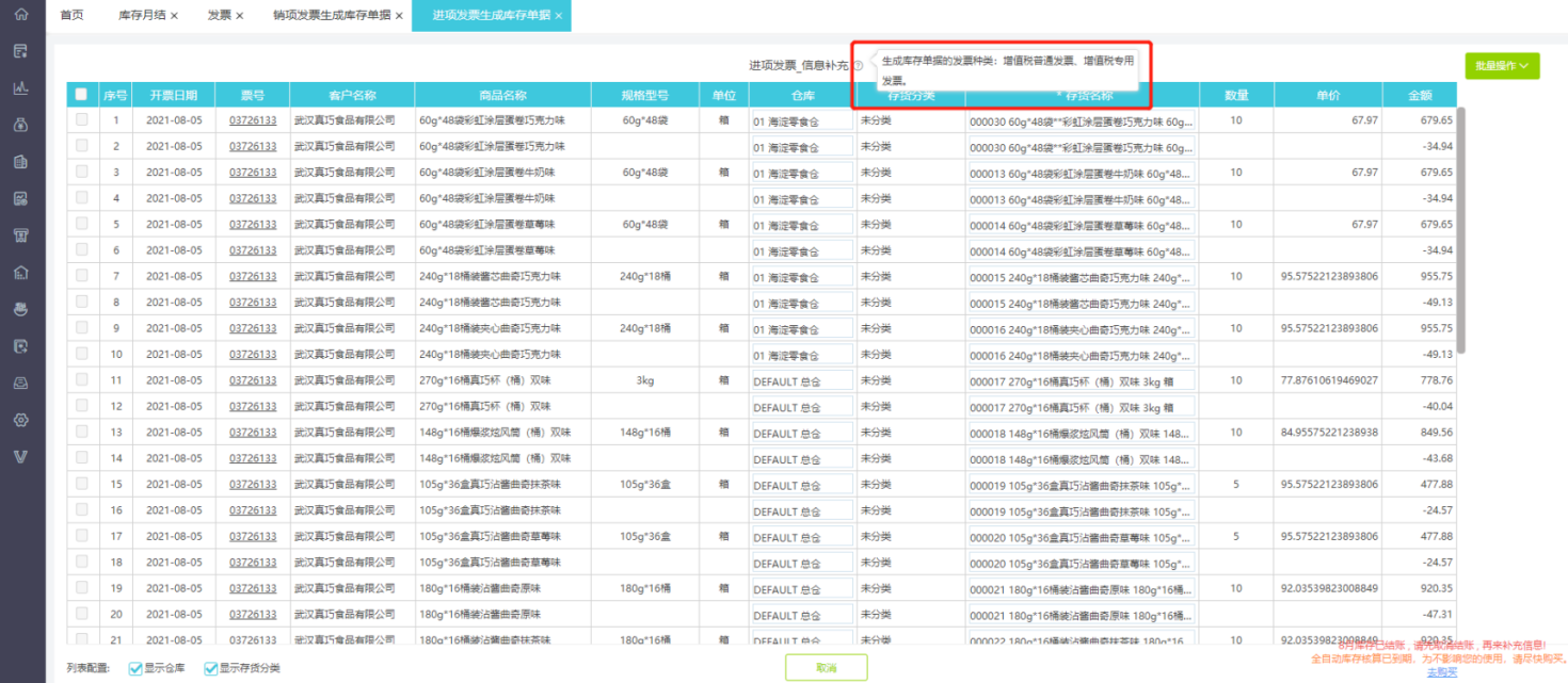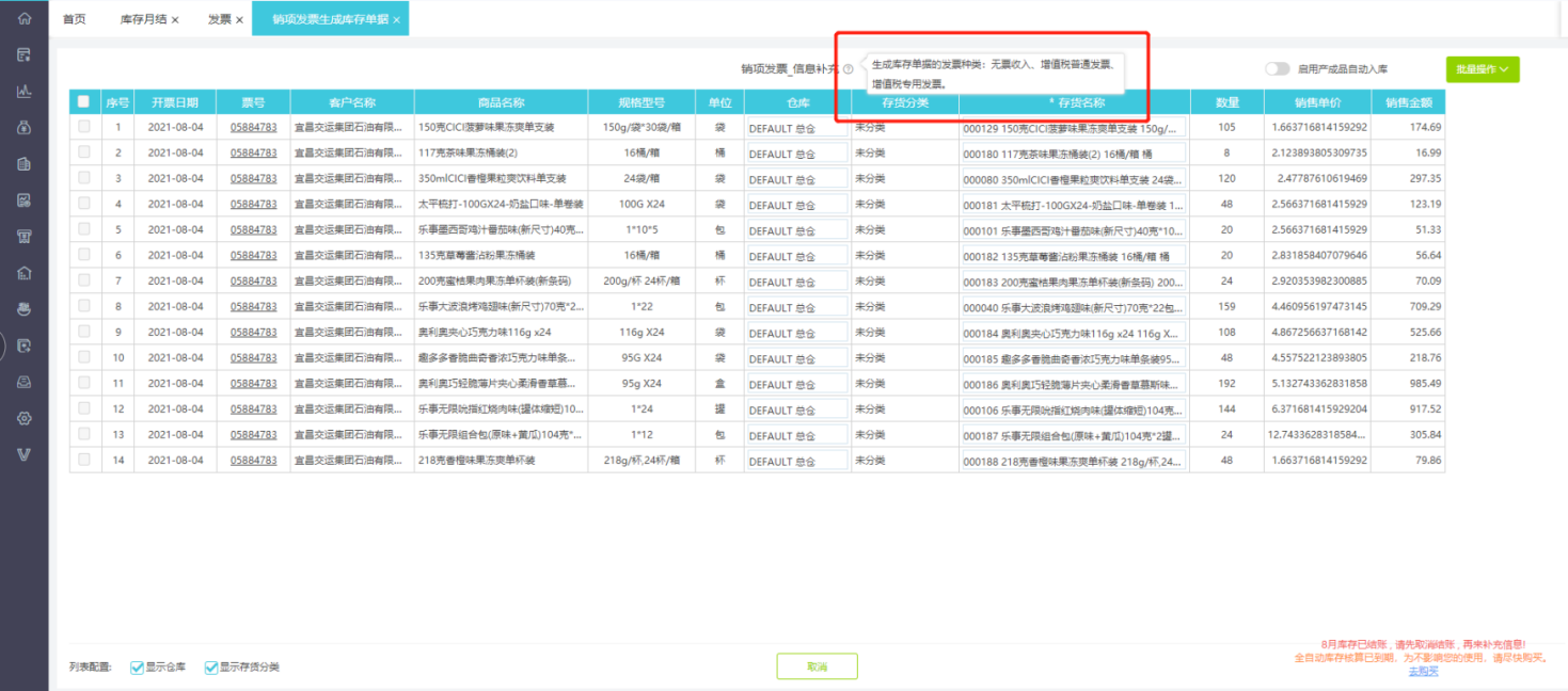 客户小刘在启用库存核算模块后,使用发票生成出入库单时发现有些发票种类不能生成出入库单据,不清楚软件具体支持哪些发票类型,并且发票生成出入库单时有些存货名称匹配是空的,这个是为什么呢?我的采购、销售发票是否全部生成出入库单了,有什么办法能直接提示吗?有的时候无法推单,后来找出原因是因为结账了或者是因为该应用已过期,这个系统的控制原因可以在界面直接新增提示吗?这样就不必要在这耗时找半天查找此类原因